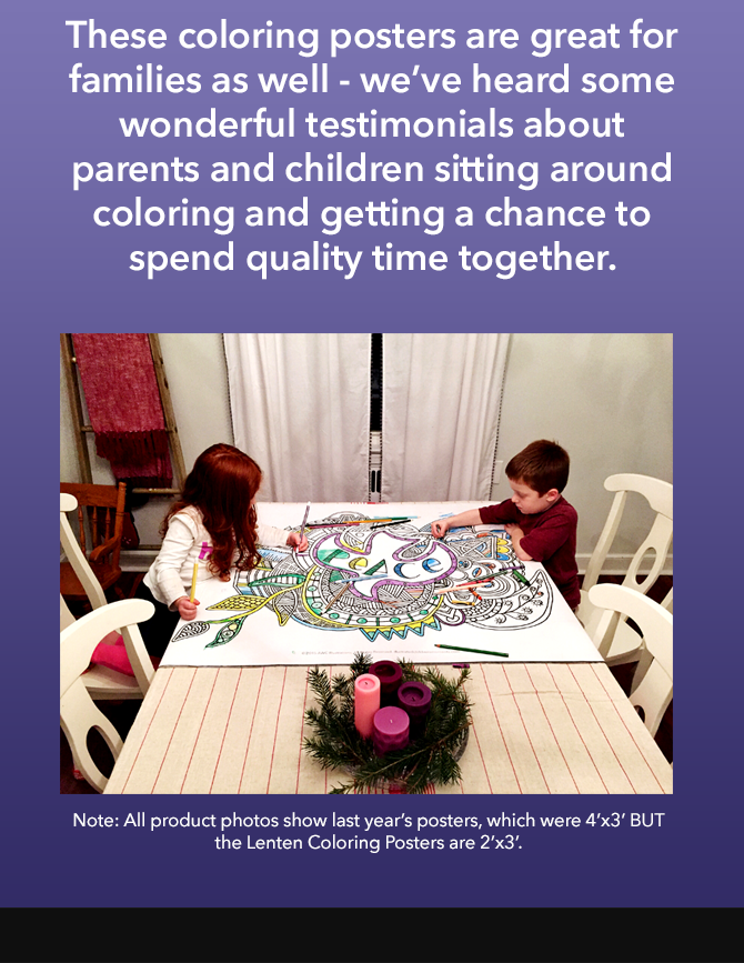 Each image was hand-drawn with pen and ink, scanned and meticulously edited and then converted into a vector file format for printing. Each poster is 2 feet wide and 3 feet tall. This size allows many hands to get around it coloring, and if you are a faith community wanting to involve more families in your Lenten programs, this size is very convenient for families to take home and complete, and easier to complete at a Wednesday night service.